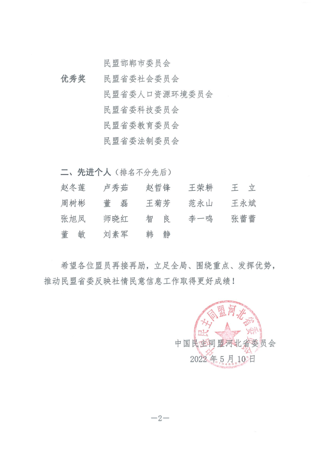 2022年5月18日,民盟省委反饋:民盟張家口市委榮獲民盟河北省委2021年參政議政工作先進單位、反映社情民意信息先進集體二等獎;安定明榮獲參政議政工作先進個人,師曉紅、張旭鳳榮獲反映社情民意信息先進個人。